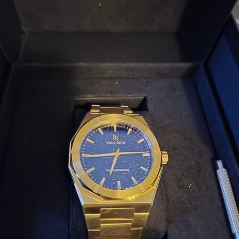 På denna klocka har länken justerats och den har varit använd vid två tillfällen, syns dock inte. Kan eventuellt finnas någon mikroskopisk repa men inget som syns vare sig med blotta ögat eller under mobilens ficklampa. Givetvis finns resterande länkar kvar i lådan tillsammans med spiken för att hålla ihop dessa.