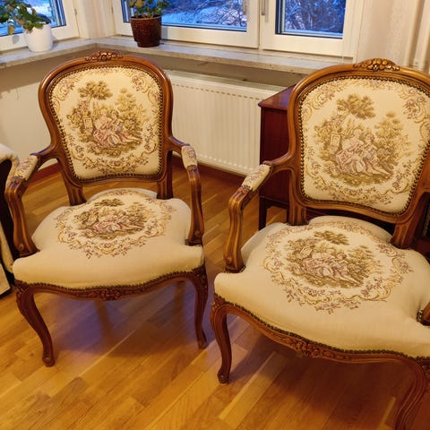 2 st fina gamla stolar i barockstil omklädda med handvävt tyg i fint skick. 300:- för båda. Finns att hämta i Stocksund
