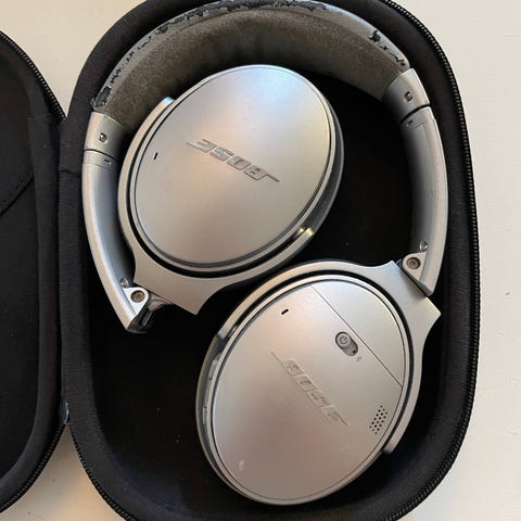 Bose hörlurar med över örat-design. Svart färg och vad som verkar vara en mjuk och bekväm öronkudde. Levereras med bådeett hårt fodral för förvaring och skydd samt laddare!