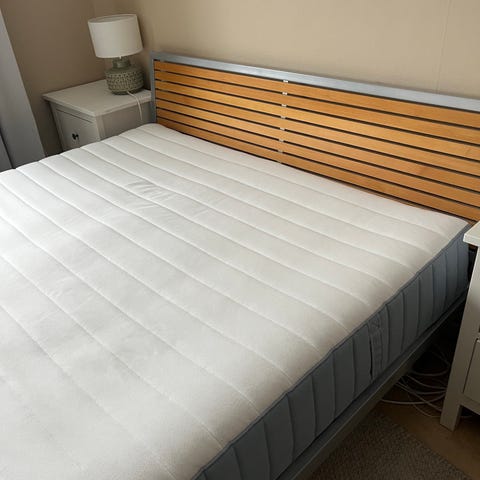 Säljer 160 säng från IKEA, grått omslag och träben. Bra skick .