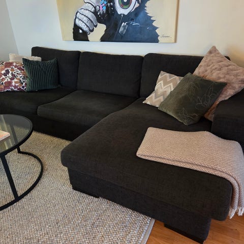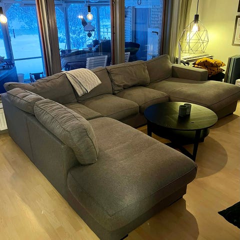 En mörkgrå soffa som använts som extra soffa, så inte jättemycket använd. Klädsel på samtliga kuddar går att tvätta.