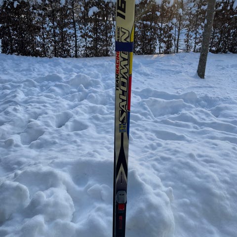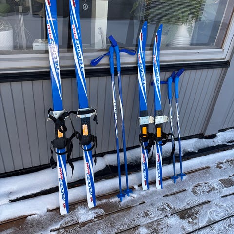2 par skidor med stavar säljes. Bindningar som spänns fast i vanliga skor.