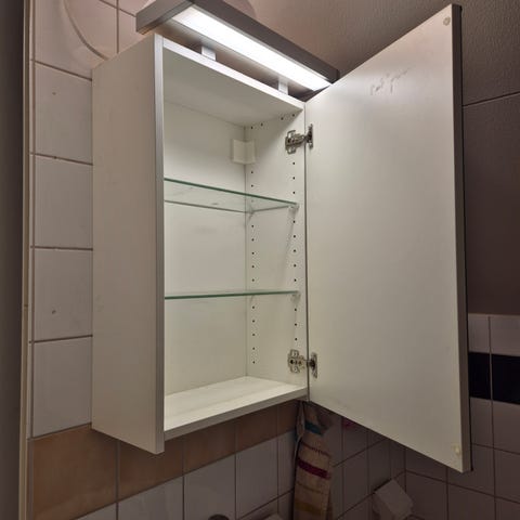Badmöbelset inklusive spegel med belysning och handfat. Setet består av underskåp med flera dörrar och ett högt skåp för förvaring.