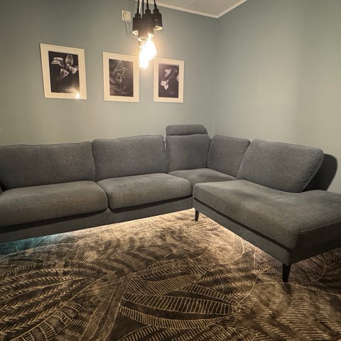 Grå hörnsoffa med schäslong XL till vänster och en divan på höger sida. Två stycken nackkuddar ingår. Plats för många där hela familjen kan umgås, eller plats att sträcka ut sig ordentligt och ligga bekvämt framför tvn.