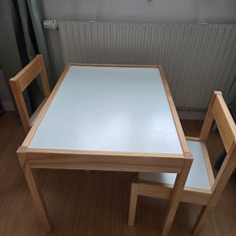 Vi har haft möblemanget i 2,5 år och använt det som ett matbord och pysselbord för våra barn i köket där även gästande barn kunnat äta vid besök.