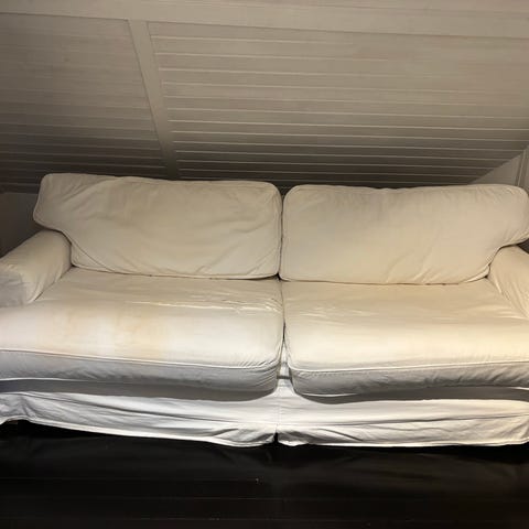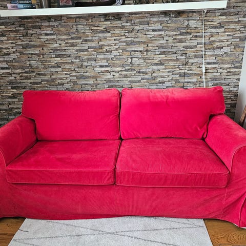 IKEA EKTORP 2-sitssoffa i grått tyg av bomull. Soffan har ett quiltat mönster och en enkel design med vita ben. Passar för vardagsrum eller mindre utrymmen.