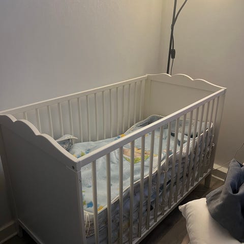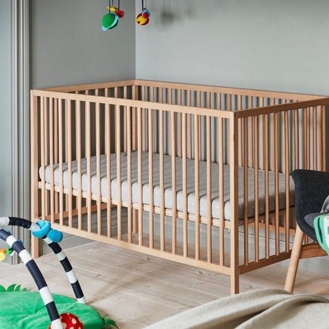 IKEA spjälsäng i trä, anpassad för barn. Sängen har en naturlig träfärg och är konstruerad med spjälor för säkerhet. Passar som barnsäng och är utformad för att ge en stabil och trygg sovplats för små barn.