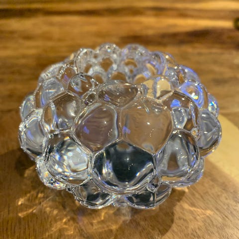 Orrefors ljuslykta i glas och med silver”metall” på undersidan. Modellen heter ” Discus” och designad av Lars Hellsten. Diameter 14 cm. Fint skick.