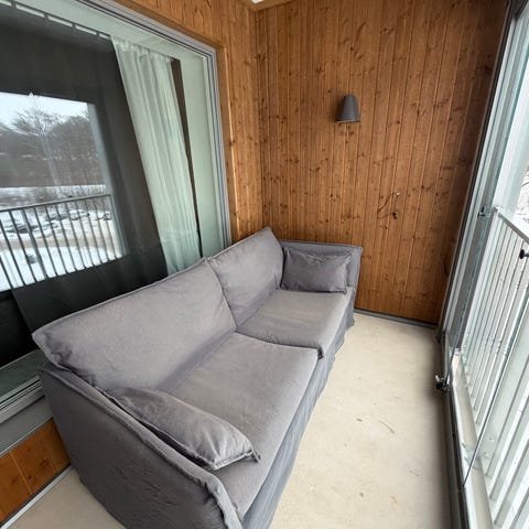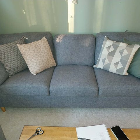 Soffan är något solblekt på ryggen och ärmstöden. Nya klädslar finns att köpa på nätet.