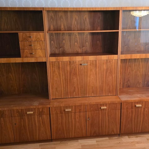 3 sektioner i trä med flera hyllplan och två skåp nedtill barskåp med belysning.