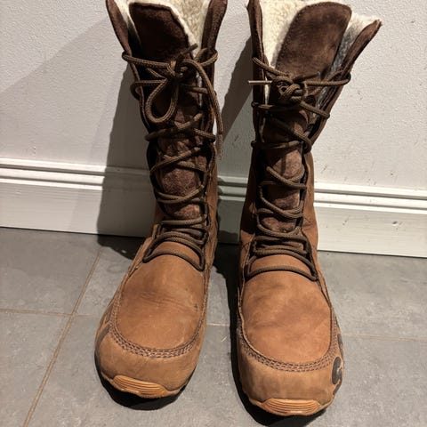 Sorel barnskor i unisexmodell, storlek 40. Skorna har en kombination av material som inkluderar ett slitstarkt yttre och en varm, fodrad insida. De är utformade för att ge skydd och komfort i kallt väder.