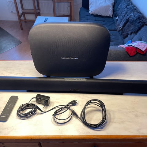 Harman Kardon Omnibar+ ljudsystem inklusive subwoofer, soundbar och fjärrkontroll. Systemet är sparsamt använt och levereras med nödvändiga anslutningskablar. Lämpligt för användning i hemmabio eller ljudförbättring för TV och musik.