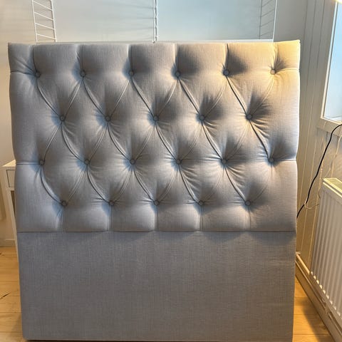 Bed head / sänggavel gjord av en möbeltapetserare. Träs in vid huvudändan. Filt på baksidan så att den inte repar väggen.