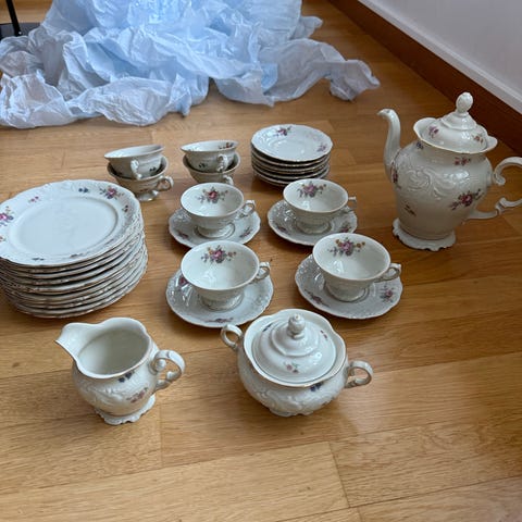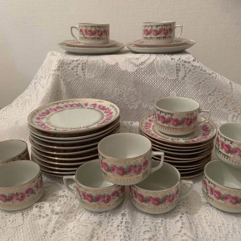 Söt äldre kaffeservis för 12 personer; koppar, fat, assietter, kaffekanna, sockerskål, gräddkanna, kakfat, 4 ljusstakar, 2 askfat samt 9 koppar och 11 fat. Kan finnas någon liten spricka eller nagg men i huvudsak väldigt fint skick.