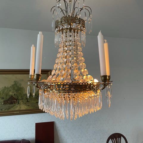 Antik kristallkrona som helt nyligen renoverats med bytt el och dimmer för 4200kr. Höjden är 83 cm med diameter 55. Mycket vackert ljus från starkt till gödande svagt med dimmer
