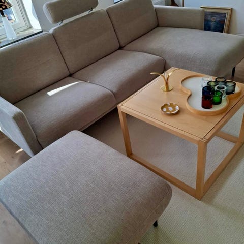 Ilva hörnsoffa klädd i brun textil med träben. Soffan har en L-formad design med schäslong på ena sidan. Passar för vardagsrum och erbjuder plats för flera sittande personer.