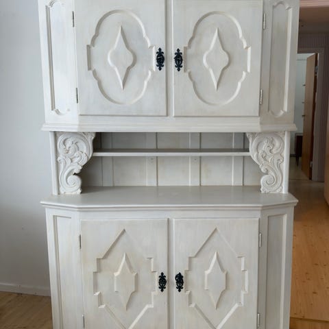 I dag är skåpet ombyggt till ett TV-skåp med hyllor invändigt, men inredningen kan tas bort om man vill återställa det till ett förvarings- eller garderobsskåp.