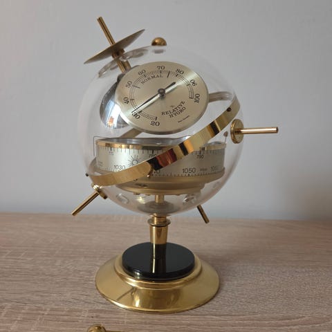 Väderstation med klocka och termometer i trä