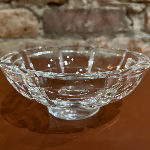 Detta är en Orrefors Sofiero skål, designad av Gunnar Cyrén. Formgavs år 1960.