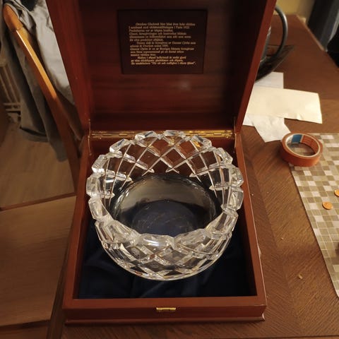 Kristallskålen var tydligen en avtackning och jubileumspresent från företaget DUNI med personens namn och efternamn (deras inskriptionen som minne av företaget i botten under skålen).