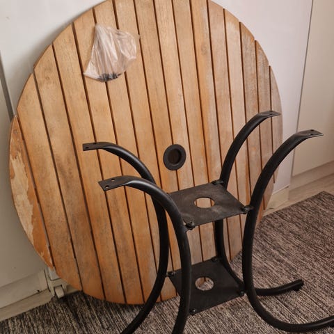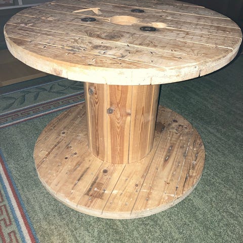 Trä kabeltrumma som har målats vit. Kan användas som bord eller dekorativ möbel. Rund form med hål i mitten och slitsar på sidan.