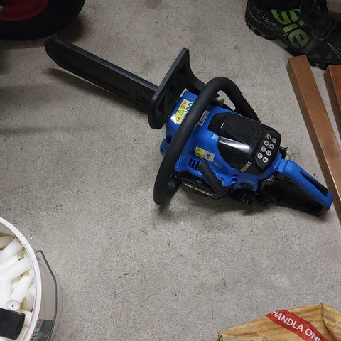 Detta är en Stihl motorsåg och är sannolikt en modell 017 eller 018. Det medföljer en kedja och originalboken. Jag har försökt starta den men det gick inte, men det är säkert lätt att fixa.