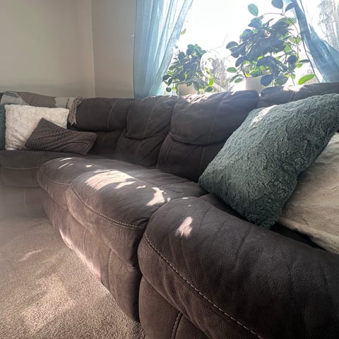 Modulsoffa med 6 delar i två brun/beige nyanser. 3st mindre delar (95x57cm) och 3st större delar (95x95cm) med ryggstöd och armstöd. Går att modulera efter eget behag.