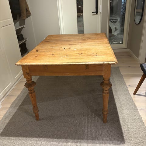 Bordet är i gott begagnat skick med normalt bruksslitage. Det finns lättare repor och märken från användning genom åren, vilket är naturligt för ett vintage-bord och ger det patina och charm. Se bilder för detaljer.