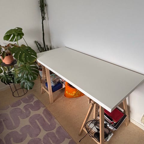 • Skrivbord: BEKANT vit, 140x60 cm. Benen är manuellt höjdjusterbara (65–85 cm) för att passa din sittställning perfekt. Under skivan finns ett smart nät för att dölja kablar.