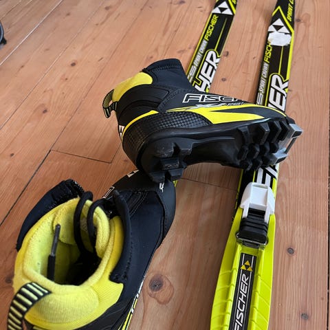 Stavar 142 cm. Skidor drygt 200 cm. Bindning passar även kängor. Inga speciella pjäxor behövs.