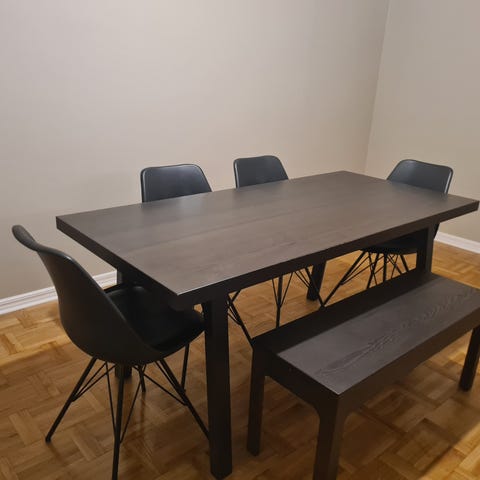 Säljer vårt matbord tillsammans med 6 matchande stolar. Vid köp ingår två bänkskivor – den som sitter på bordet idag samt en extra bänkskiva som är helt ny och ligger i sin original förpackning.