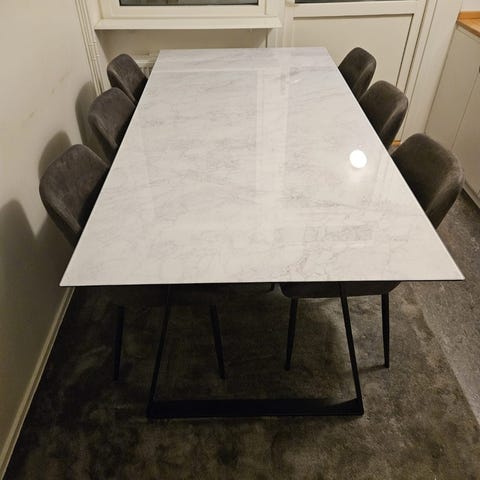 Bordet och stolarna är i mycket fint skick och ger ett riktigt exklusivt intryck i rummet. Perfekt för dig som vill ha en modern och lyxig matplats.