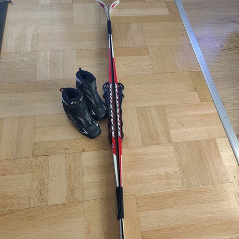 Paket med klassiska skidor, skateskidor samt kombipjäxa strl 35.
