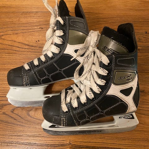 CCM Ishockeyskridskor för barn i storlek 32, svart och vit färg. Skates är avsedda för ishockey och har traditionell snörning.