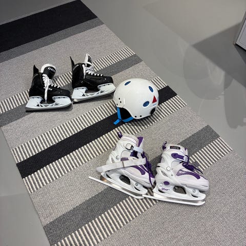 Skridskor, hockeyrör (34-41), ishockeyhjälm, ryggskydd