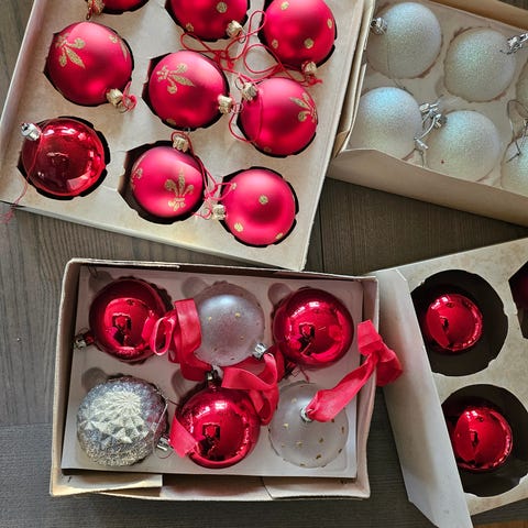 Jul Dekoration bestående av fyra/4 packet julgranskulor i rödfärg