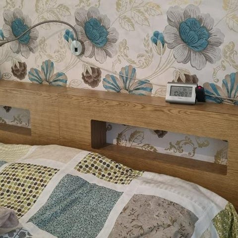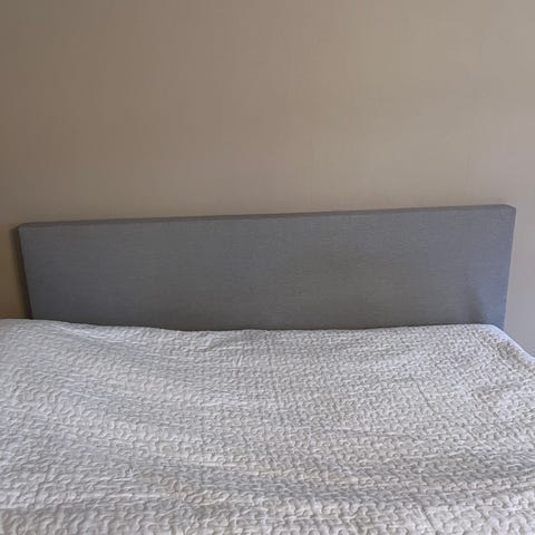 Rejäl sänggavel i Ek men inbyggda hyllplan på varje sida. Fästen baktill som avstånd från vägg. Defekt från vattenglas på ena facket. Mått B120xH99. Hämtas i Alingsås.