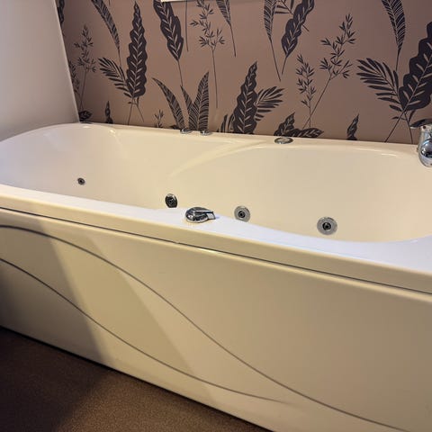 Badkaret är ergonomiskt format för bekväm liggposition och levereras med kromad blandare och handdusch monterad på karet.