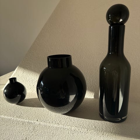 Dekorativ stor vas i keramik med ett unikt utseende. Vasen har en rund form med ett hål i mitten och ett handtag på sidan. Den har även dekorativa detaljer. Se bilder. I nytt skick. Färg svart. Mått: 34*8cm
