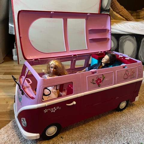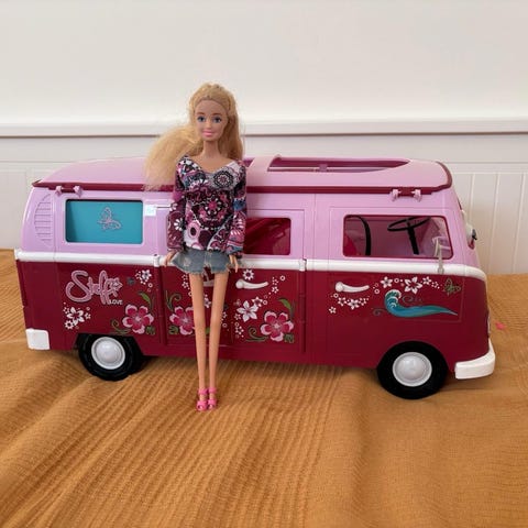 Barbie husbil i rosa och rött med detaljer och inredning.