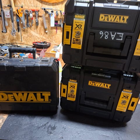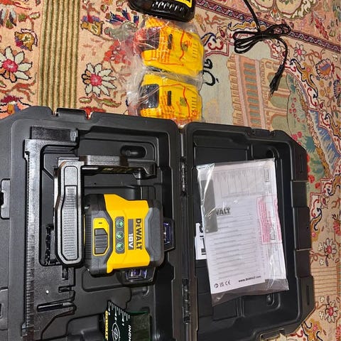 DeWalt DW082 laseravvägare med kompakt design och inbyggd måttskala i centimeter och tum. Enheten är utrustad med ett robust hölje och levereras i ett bärbart förvaringsetui. Laseravvägaren är avsedd för precisionsmätningar och avvägning inom bygg- och hantverksarbeten.