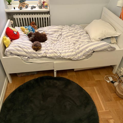 IKEA juniorsäng i vitt utförande. Passar barn och är anpassad för juniorålder. Sängen är tillverkad i material som är typiskt för IKEA:s barnmöbler.