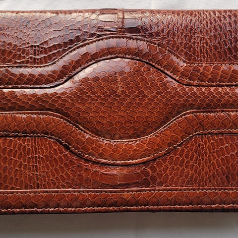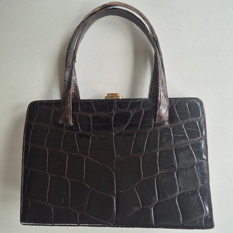 Välbevarad handväska med vintagelook i brun krokodil-/alligatorpräglad läderimitation.