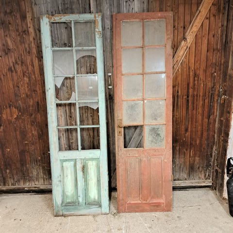 Två gamla trädörrar med glasrutor. Dörrarna har slitage och patina som visar deras ålder. Passar för renovering eller som dekorativa inslag i hemmet.