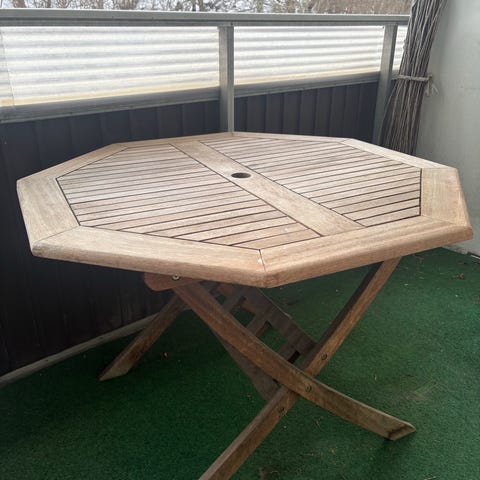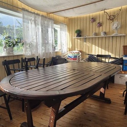 Sparsamt använt och har stått i ett uterum. Utebordet är 230×98 med iläggsskiva.