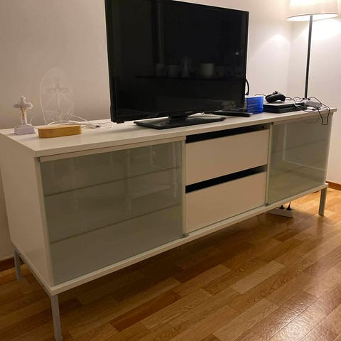 Svart TV-bänk. Minns inte om det är Mio eller Jysk jag köpte den från. Mycket bra skick, inga repor eller liknande. Jag har dock gjort 2 egna hål i baksidan för att dra sladdar. Se Bild. Går säkert att täcka över lätt eller snygga till. L158 B40 H46