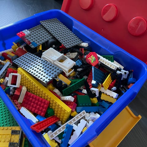 LEGO byggklossar i olika former och färger, äldre och nyare för varierande byggprojekt. Bottenplattor, hjul m.fl. smådelar. 9 kg, kommer i plastback på hjul resp förvaringslåda i papp med insatser för sortering.