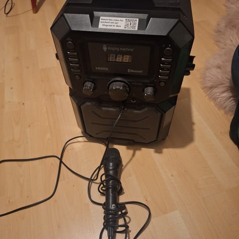 Karaoke Microphone trådlös handhållen mikrofon i svart färg. Mikrofonen har flera knappar för kontroll och är avsedd för karaokeanvändning. Produkten är utrustad med funktioner för ljuduppspelning och inspelning, och kan anslutas via USB och AUX.