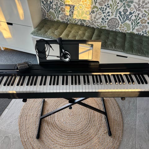Yamaha P-45 Digitalpiano med 88 tangenter i svart färg. Inkluderar stativ, stol, hörlurar, notställ & såklart pedal/strömkabel.