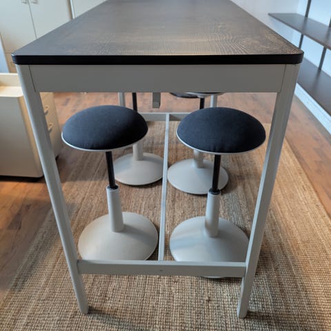 Måttbeställda Industriellt arbetsbord med metallram och massiva furuträskivor. Bordet har flera hyllor för förvaring och är utrustat med hjul för enkel förflyttning. Passar för användning i verkstäder, butiker eller liknande miljöer där flexibel arbetsyta och förvaring behövs.